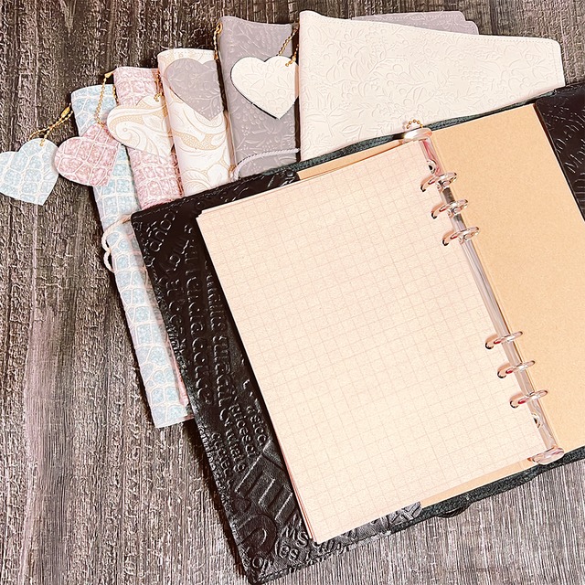 本革でハンドメイドされたA5サイズのカバーです。 イタリアからのインポートレザー、ブラックのみ国産レザーとなります 用途としては、身近にある100円ショップなどで販売されている「6リングA5バインダー」のサイズにピッタリでお作りしています。 もちろんA5サイズのノートやファイル、バインダーなどを厚みに合わせて着せ替えできるサイズ感です。 何のカバーにするかは、アイデア次第❤️ セット内容 ◎6リングA5バインダー用レザーカバー ◎自分でA5リフィル 20枚(8月新作ペーパー) ◎ハートチャーム(同レザー) ◎ノベルティ 5枚 ◎気まぐれプチおまけ ◎ランダムペーパー 10枚 見開きサイズ 横:約40cm、縦:約24cm ゴムどめ
