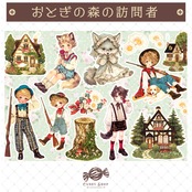 赤ずきんちゃんを狙うオオカミさんと、こっそり森を見守る狩人のコラージュシート。
