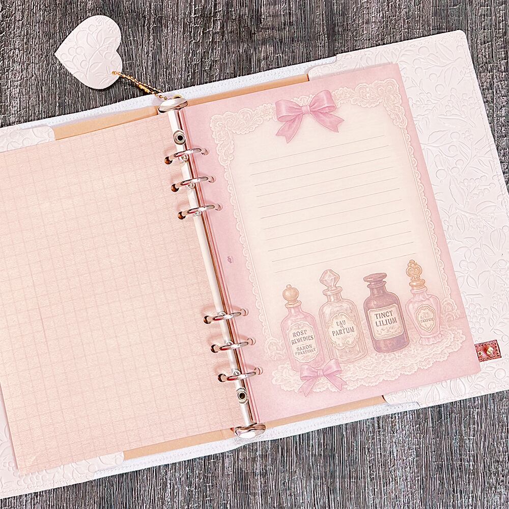 用途としては、身近にある100円ショップなどで販売されている「6リングA5バインダー」のサイズにピッタリでお作りしています。