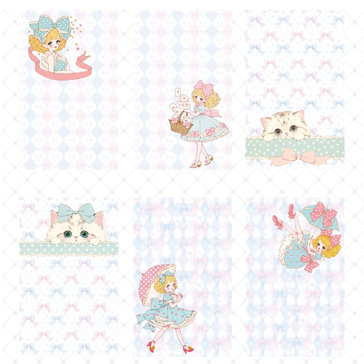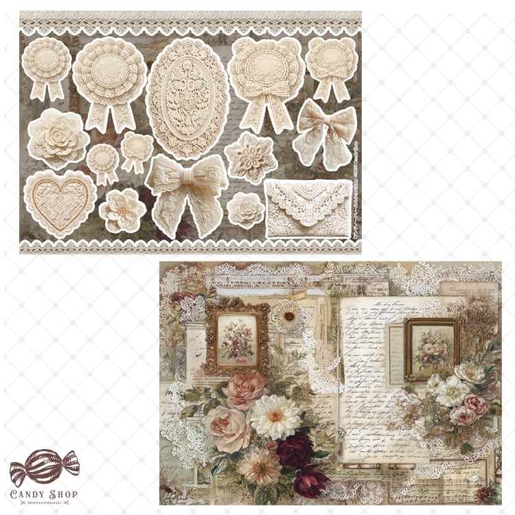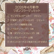 「リボン&リボンパレード」「リボンラベルセット」「ツイードポーチポケット」「アンティークレースの小さな宝物」「ショッピングの思い出」「花と記憶のコラージュ(両面背景)」