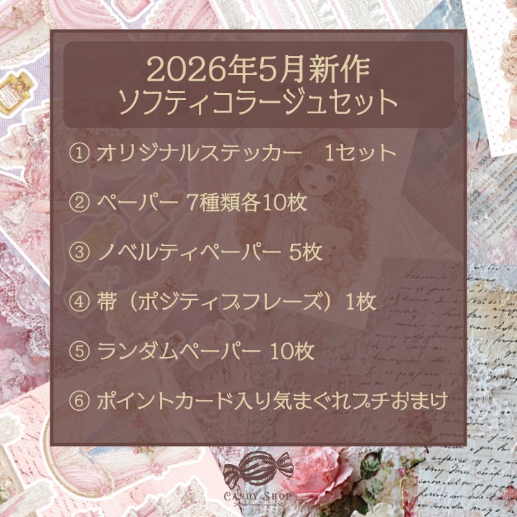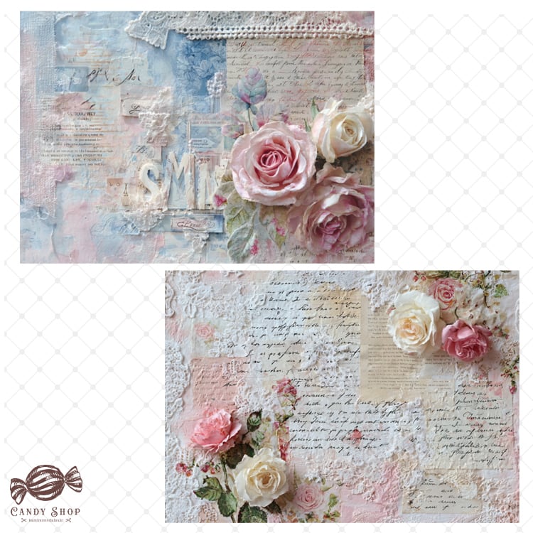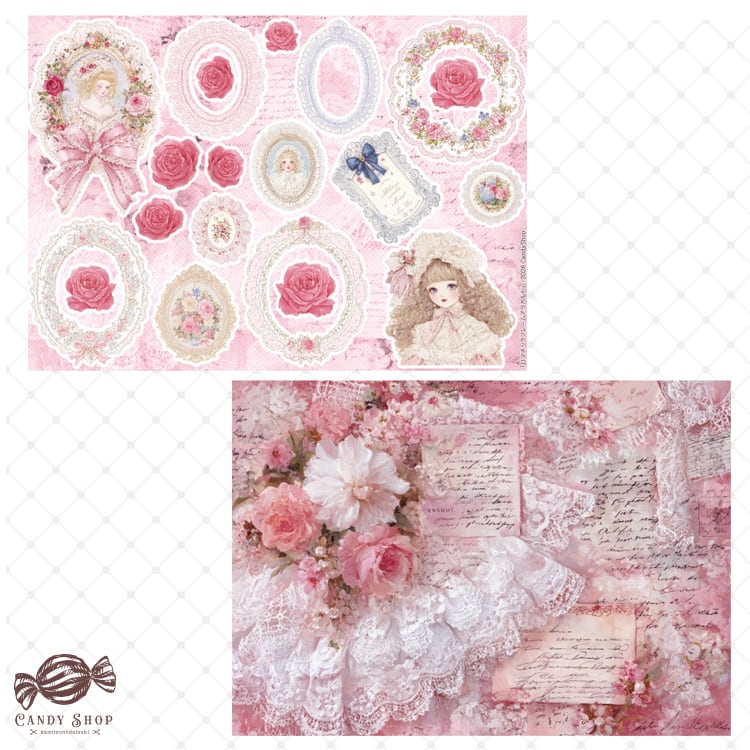 「ドレープの誘惑」「窓辺のひととき」「ロマンチックフレームアラカルト」「ガーリーエフェメラ」「薔薇物語」「白いボーダーレース」「ローズメモリー(両面背景)」